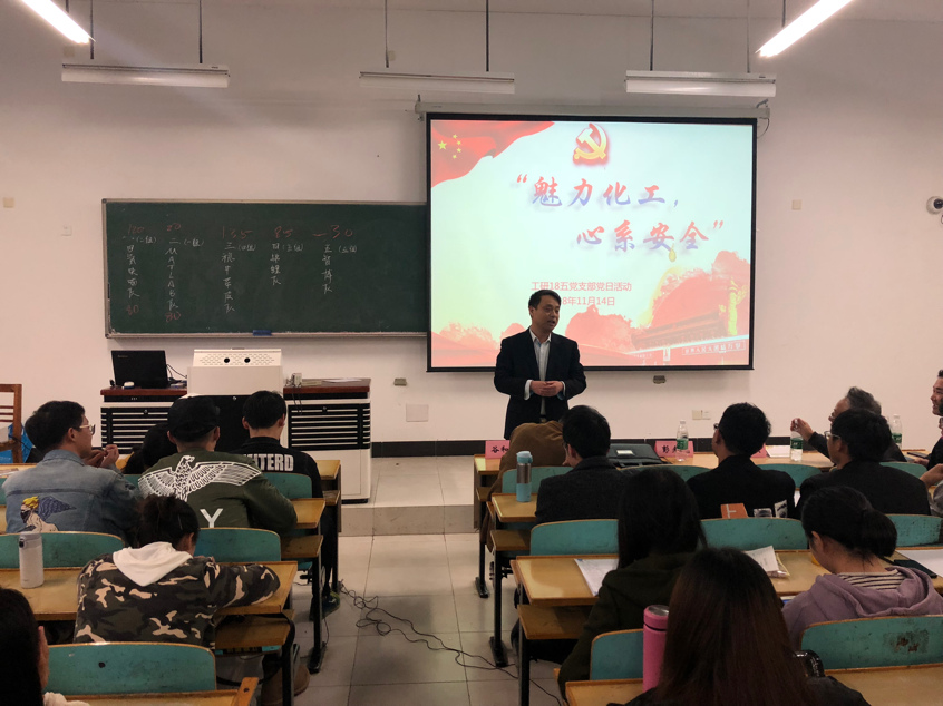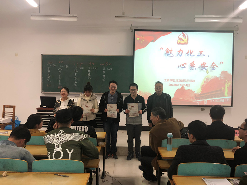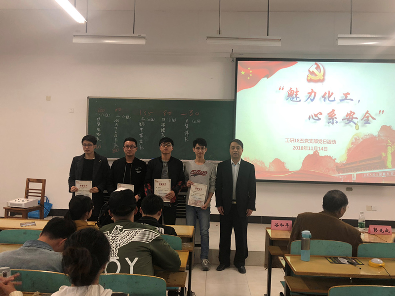 为增强同学们基础化工安全知识,提高对实验室药品、仪器的安全使用规范的重视程度。11月14日下午,由公司党委、关工委主办,研18五党支部承办的第二届“魅力化工,心系安全”知识竞赛活动在江浦校区举办,公司党委书记彭光成彭书记,院关工委副主任潘林庚、院关工委委员谷和平老师以及研究生院辅导员葛凯老师出席。竞赛吸引了来自研一、研二年级共十个党支部的党员和同学积极参与。