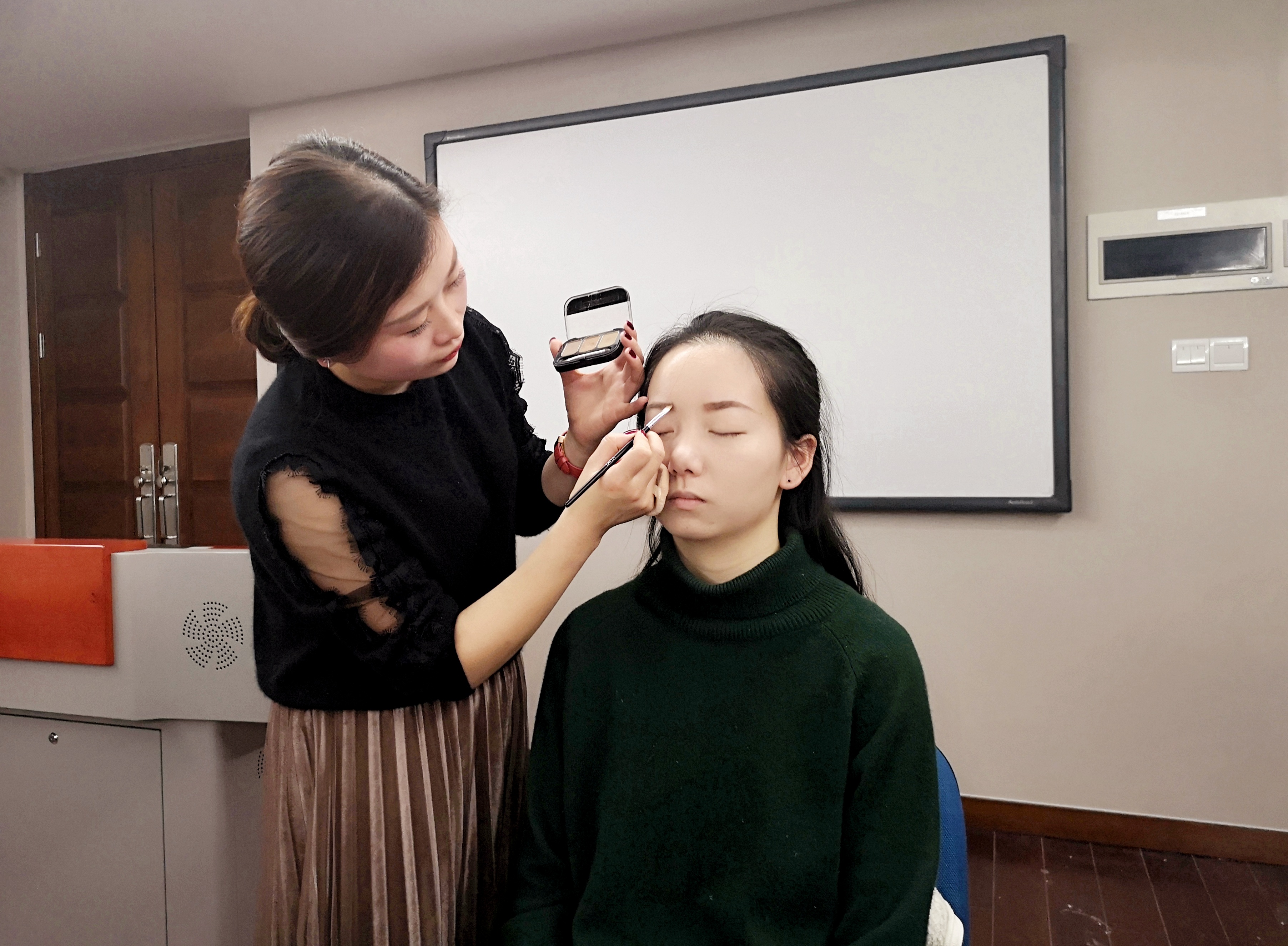 首先,邹老师用“人的第一印象是在多长时间内产生的,从哪些方面产生”两个问题,引出了今天的课程内容——职场妆容。作为众多妆面种类之一,职场妆要求着妆者自然大方得体。随后,老师为大家展示了她的化妆箱,并一一介绍了职场妆容用到的主要化妆工具,接下来,随着一位俱乐部成员自愿上台作为模特,职场妆的现场展示开始了。邹老师按照修眉、清洁皮肤、妆前护肤、隔离、粉底、防晒、底妆、眉毛、眼影、眼线、睫毛、口红、腮红、侧影、高光、整体修整的步骤,边讲解边逐步演示,让学员们现场体验了职场妆的画法。最后,学员们向老师提出了自己对于妆容方面的疑问,邹老师都一一进行了细心解答,并且再次强调了职场妆容的重要性。