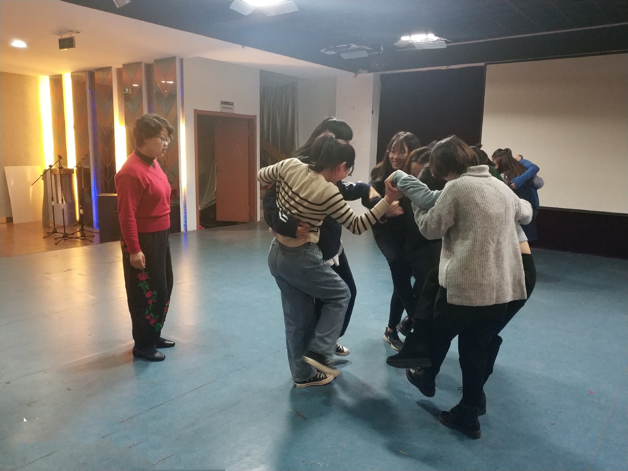 接下来舞动生命课程正式开始,首先是热身环节,张老师让每一位同学在介绍自己的同时,带领大家做一个身体部位的热身,热身环节结束后,活动渐渐进入高潮,老师将同学们分为两人一组,在无声的环境中轮流用动作对对方做出回应。虽然只有短短的几分钟,却能感受到从担心到信任,从不熟悉到连结,从不同频到同频的微妙变化。紧接着,老师又将学员们分为七人一组围成圈,在圈中心的一名同学完全放空自己的身体,将自己交由身边的小伙伴来依托。嘴巴可以说假,但身体不会,我们通过肢体配合去舞出信任、协作以及领导力。