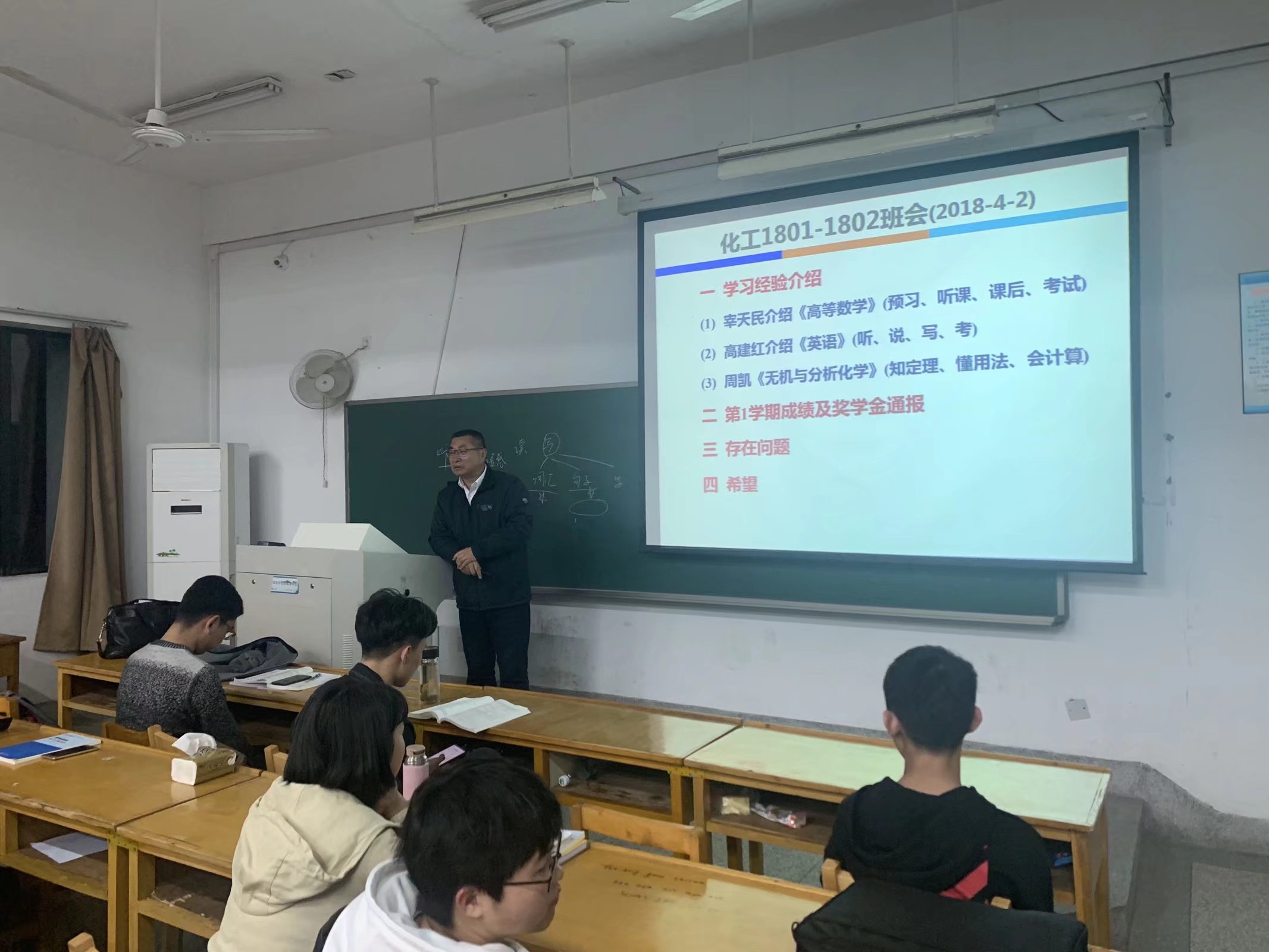 距离开学已经过去一个多月的时间了,为充分调动同学们学习的积极性,明确学习目标,化工1801、1802班于4月2日晚召开开学动员会,化工1801、1802班班主任武文良老师、助理班主任及两班全体同学参加此次会议。会议由化工1801班班长王凤楚主持。