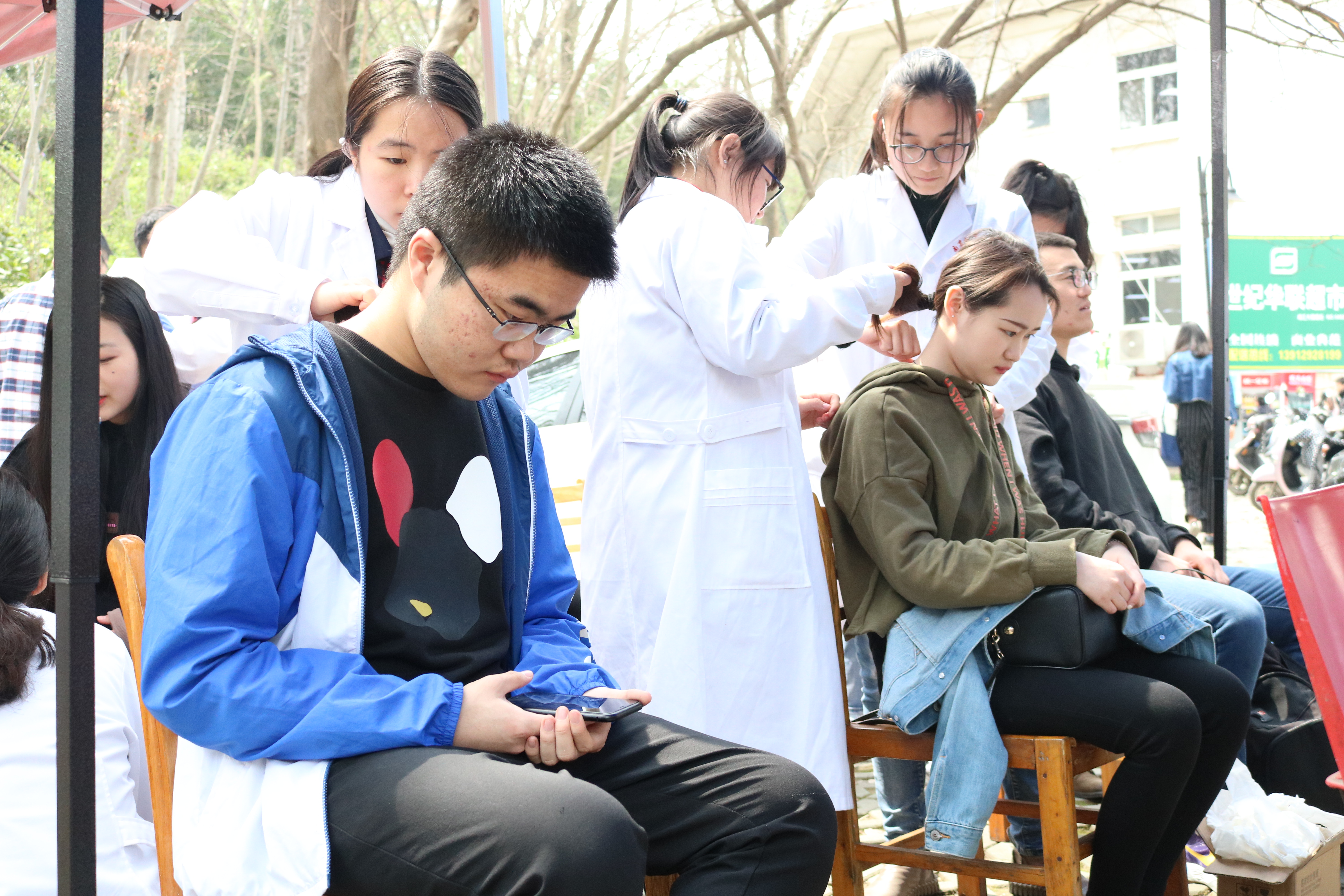 本次活动有艾灸、刮痧、推拿以及量血压独具中医特色的四个环节。清晨,身着白大褂的南中医志愿者们就站在春日的暖阳下等待着,南工大的同学们、途经的旅人以及校工们纷纷驻足。南中医同学们用艾柱置于皮肤上方,以艾热刺激其表穴位,活络体验者筋骨。参与者的颈部在负责刮痧志愿者们的反复刮摸下,体内血液循环加速、部分毒素被清除。手法灵活的志愿者推、按、揉、捏。在手和指的灵活配合中,体验者舒筋活血。当然最受欢迎还是量血压,年长者大都乐于参与量血压。量血压的同学们首先询问参与者的身体状况,在用仪器测量后,又给出了关于健康生活的小建议。临近午时,化爱社的小伙伴们热情地邀请南中医的志愿者们到食堂就餐,让他们体会南工大的味道和南工人的温暖。