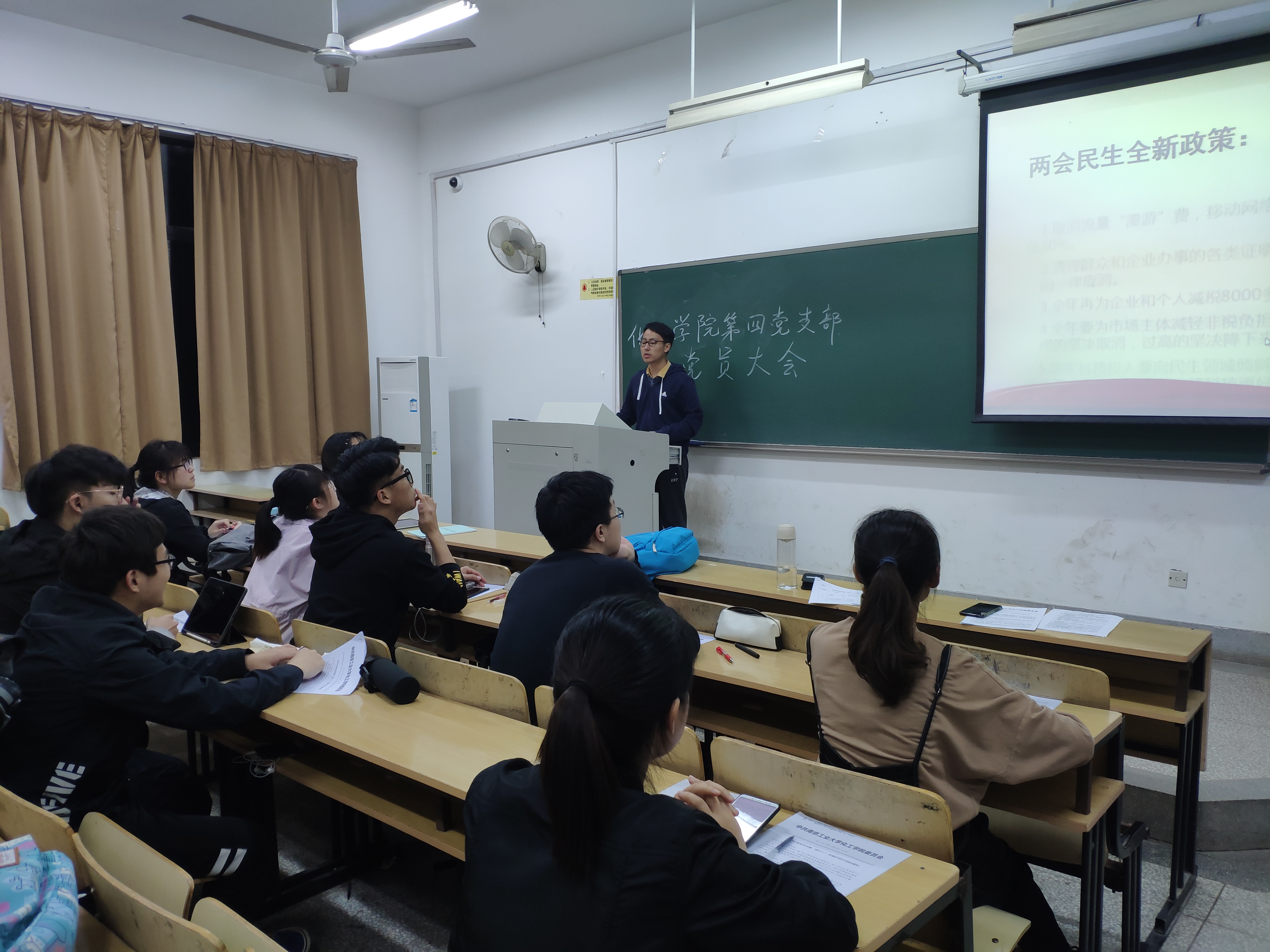 会上,支部书记李府赪同志和支部全体党员一起回顾两会进程,带领全体党员同志学习泰山“挑山工”精神,从脱贫摘帽、定点帮扶、广泛交流等方面联系党支部实际,分享学习两会的切身感受;李亮同志从民生方面纵观两会,为全体党员同志总结两会后出台的民生政策,加深党员同志对两会民生问题的深刻领会;王嘉瑶同志抓住5G、住房及环境三个方面的问题,横向解读两会精神,向全体党员介绍垃圾分类知识、5G通讯的发展情况以及住建部对于“房住不炒”的具体力行措施,语言生动幽默,富有趣味。三位同志讲述完毕后,与会党员积极发言,互相交流各自的观点看法。