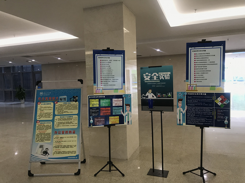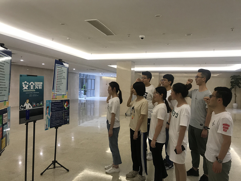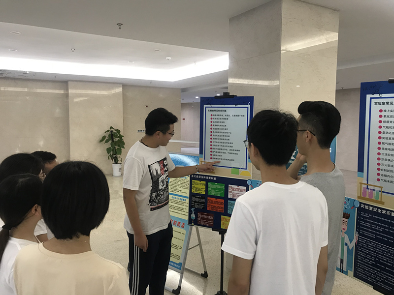 最后一个环节是化工安全海报宣传。在重点实验大楼一楼中厅,支部成员邀请来往的实验室员工浏览海报上相关的安全知识,向大家宣传实验室安全的重要性。