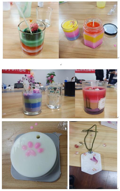 本次DIY利用大豆蜡、蜂蜡和透明蜡原料,通过简单的加热后,将融化的蜡液倒入模具,并以一定质量比加入精油或色素,放入灯芯、干花,制作出“香薰蜡杯”和“香薰蜡片”。经过工作人员的详细讲解和细心指导后,同学们开始大展身手。