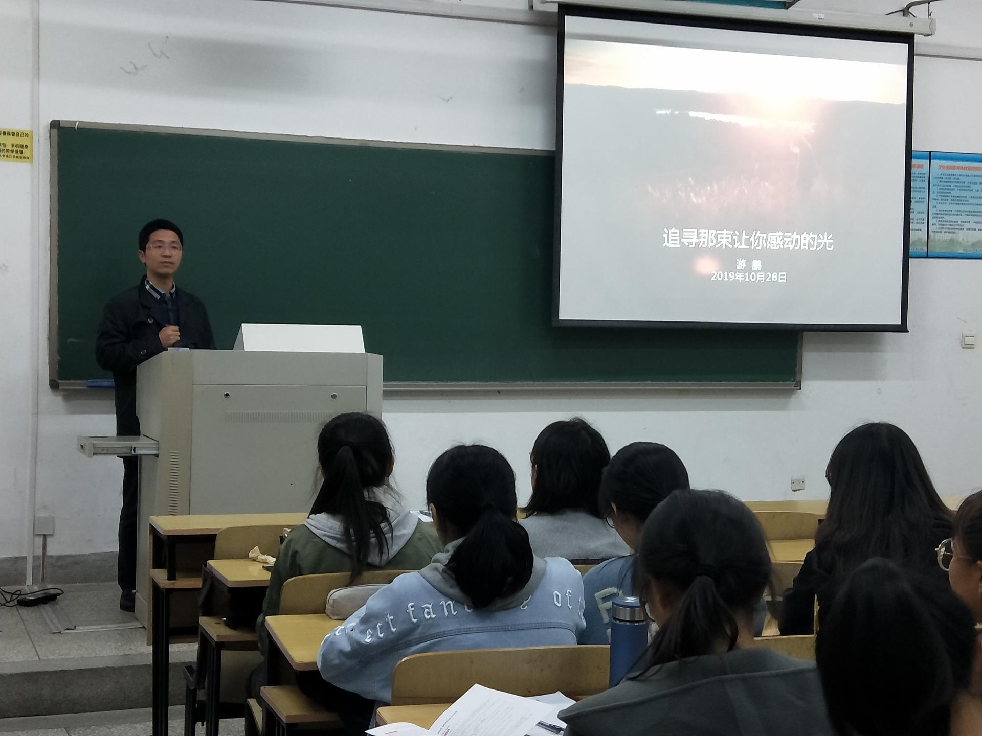 游老师以“追寻那道让你感动的光”为题,讲述了拍摄的意义——每个人的想要拍摄的东西都会不同,但是最终也离不开“记录”这两个字开始此本次课程。随后,游老师介绍了摄影中最主要的三个要素:ISO、光圈、快门。并通过一些典型的作品对这三个要素进行了简单的讲解,同时也教授了一些简单的拍摄技巧。但游鹏老师也强调了技巧并不是摄影的重点,不要让作品被机械的技巧所牵绊,自身的感受和审美才是更重要的。游老师相信只要用心发现美,多角度地观察,多想象,多阅读,多看好的作品,多拍摄,最终一定能呈现出符合自己想象的作品。之后,游老师对同学们的作品进行了点评,并挑选出好的作品让作者分享照片背后的故事。