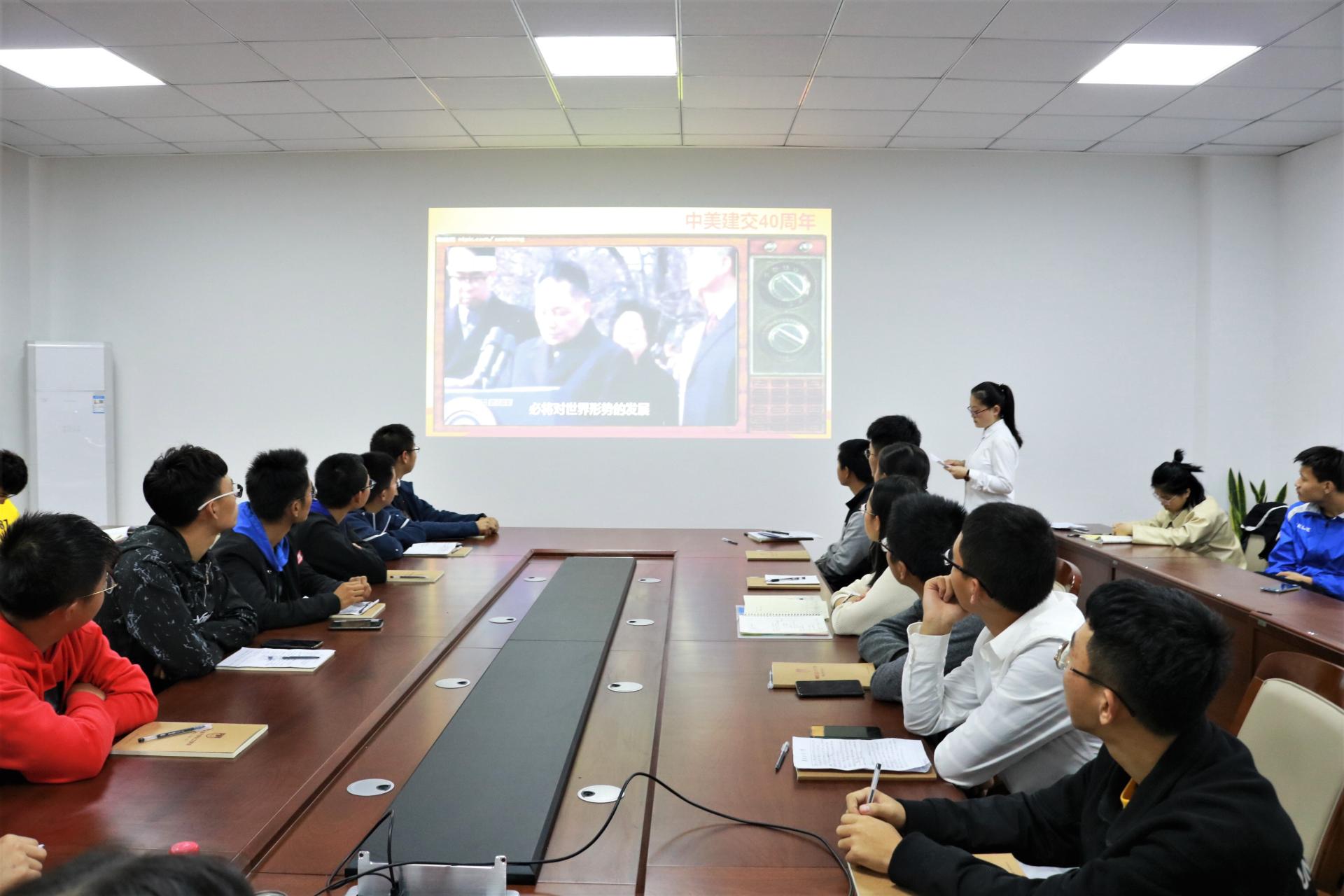 活动以焦聚时事为主题进行第二部分。以五四运动一百周年,新中国成立70周年、中美建交40周年为论坛脉络开展讨论。同学们纷纷表达了自己的观点,表示五四精神的当代价值是坚定了新时代青年的爱国精神,通过家乡的经济建设和祖国逐渐强势的外交手段感受到了祖国的日渐强大。面对紧张严峻的国际形势,同学们更是坚定的表示,作为当代的新青年,应当扎实学习专业知识,承担社会责任,毕业后努力投身于社会建设,让祖国更加强大。