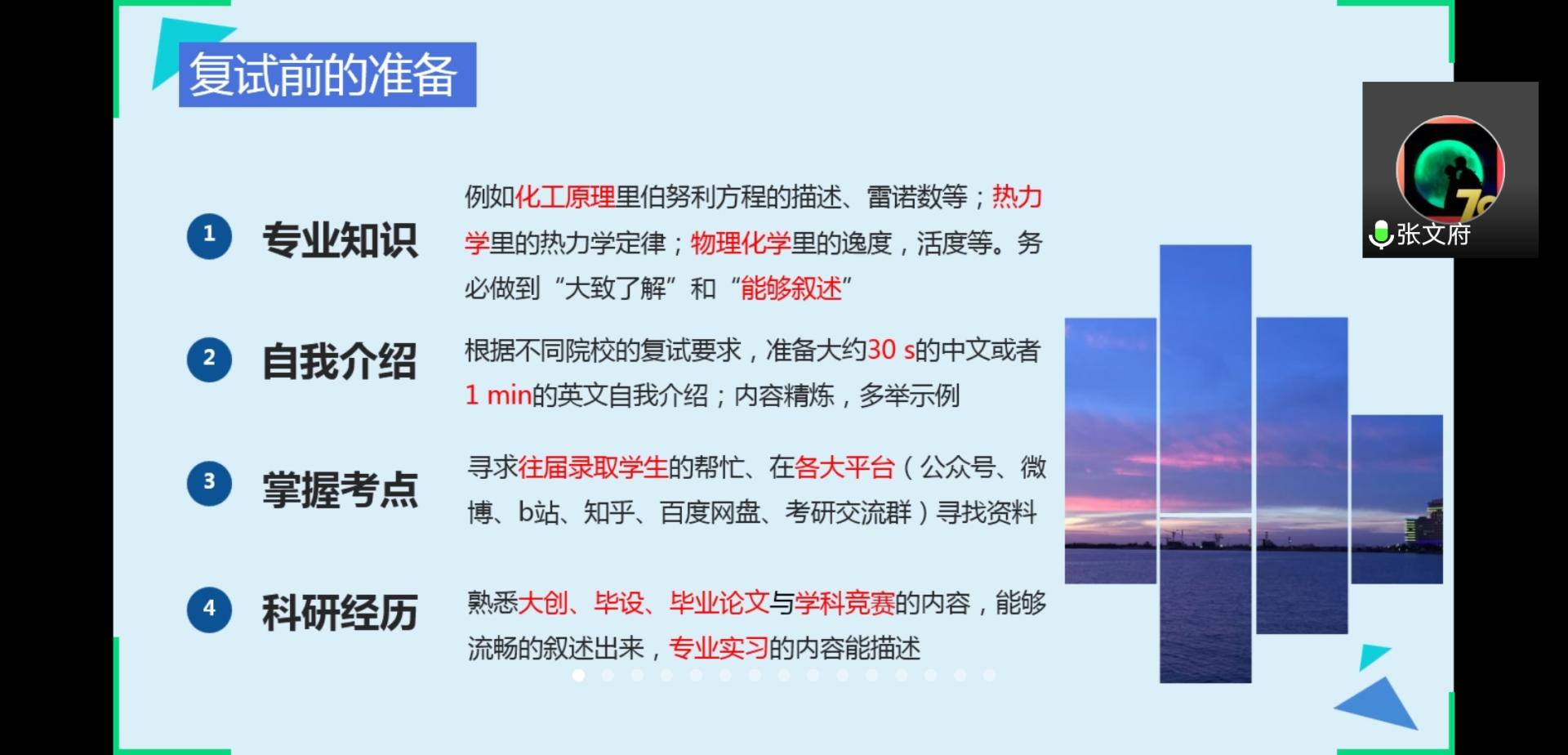 首先,张文府学长从复试前准备和面试临场发挥两个方面详细的讲解了如何准备复试,并提醒同学们,由于疫情情况,复试备战时间不断拉长,大家要好好利用这段时间多学一点,稳住就是王道。随后,郭亚杰学姐从天津大学的分数计算,复试流程,参考资料,导师情况四个方面详细的介绍了复试整个流程,她还强调了复试中笔试的重要性并传授了一些复试的小技巧。最后,汪辉林学长详细的介绍了华东理工整个复试的流程并告诉考研员工复试中常见的提问和回答。一个多小时的交流会内容丰富,会后同学们纷纷表示干货十足,考研复试备考更有信心了。