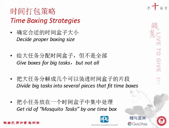 以事件数量为划分标准,我们可以将时间管理分为四个等级:个、十、百、千。当待办事件为几个时,我们主要把握“要事第一”的原则,在保证避免帕金森定律的前提下,为自己建立合理的待办事项列表。当待办事项达到几十个时,我们需要进行“时间打包”,即根据事件重要紧急程度、任务大小、难易程度分配时间。保证重要不紧急、大任务、难任务优先分配时间。同时老师以“救火”和“防火”为例为我们解释了:将60%以上时间用于处理重要不紧急事件才更有利于我们的长期发展。当待办事件上百时,则需要我们进行时间审计,尽可能地提高“成长时间”占比,降低“不明用途时间”占比,以便我们将时间更高效地利用。