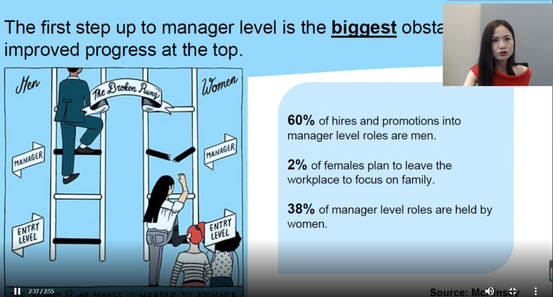 在课程的第一阶段,钱老师用真实的数据向我们展示了中国职场女性的生存现状:在中国,管理层岗位的女性比例高达35%,和世界上其他国家相比,中国的女工程师比例或为最高,但中国的女性在职场上还有很大的发展空间。工科女生一直无法打破社会对其的刻板印象,那么还未找到明路的女性应如何完成“华丽转身”呢,且听课程的第二阶段:来自大洋彼岸彭少敏博士的技巧与经验分享。她提出了让工科女打破社会刻板印象的想法与方法,也罗列了许多从求职到入职再到在职时会遇到的困惑,她通过分享自己与身边人真实可靠、生动形象的经历与故事,让我们明白“求知若饥,虚怀若愚”,明白“自信自律自省,自强自尊自爱”,更明白职场的成功也是在成就我们自己!