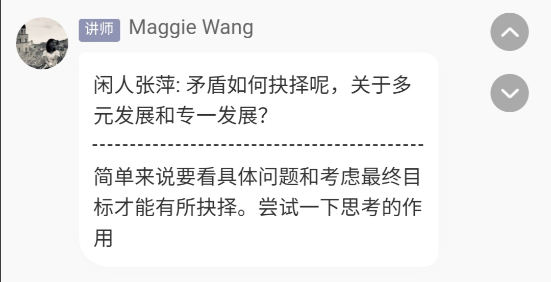 最后在互动提问环节,王贞老师在讨论区回答我们的问题,钱雯婧老师通过语音回答的方式为我们解答疑惑。通过此次课程,相信每一位同学都对自己的职业规划有了一些想法,努力的方向也变得更加明确。
