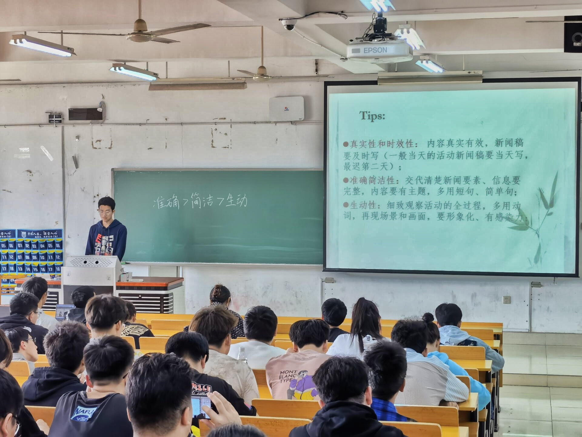 新闻稿培训部分由新闻宣传部负责人马胤主讲,分别从新闻稿件的基本要求、稿件的组成部分以及实例分析三方面进行了讲解。他表示,新闻稿的写作是一个日积月累的过程,需要各位撰稿人在日常写稿过程中多多总结,不断回顾教训和经验,并及时加以巩固。