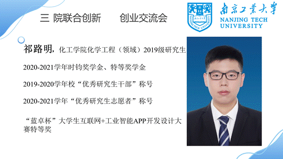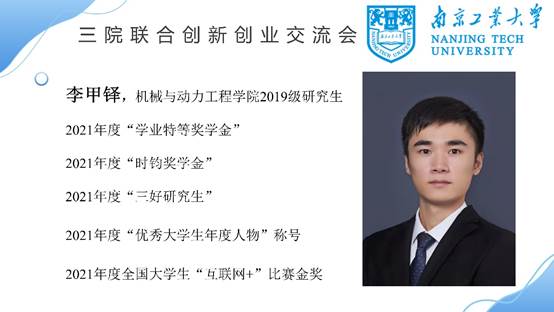 来自机械与动力工程公司的李甲铎,曾获得第七届“互联网+”创新创业大赛全国金奖。他详细介绍了自己的参赛项目和备赛经历,从校赛打到国赛一路披荆斩棘,反复修改项目文档、PPT等材料。其中, PPT是展现项目的重要方式,需要团队成员反复打磨和演练,瞄准得分点,体现项目价值,并进行一定的美化和修饰,力求充分完美地展示自己的项目。他强调,参加“互联网+”此类创新创业大赛需要投入大量的时间和精力,团队成员的协作也是必不可少的。