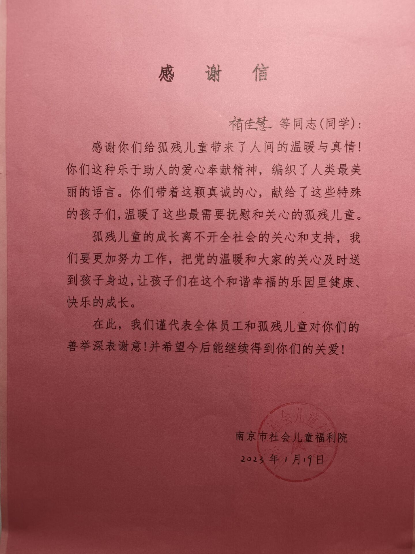 近日,太阳成集团tyc234cc收到南京社会儿童福利院送来的一封感谢信,信中写道:“感谢你们给孤残儿童带来了人间的温暖与真情。你们这种乐于助人的爱心奉献精神,编织了人类最美丽的语言”,字里行间深深表达了对化工(英才)2202班同学爱心捐赠与志愿服务的感激。