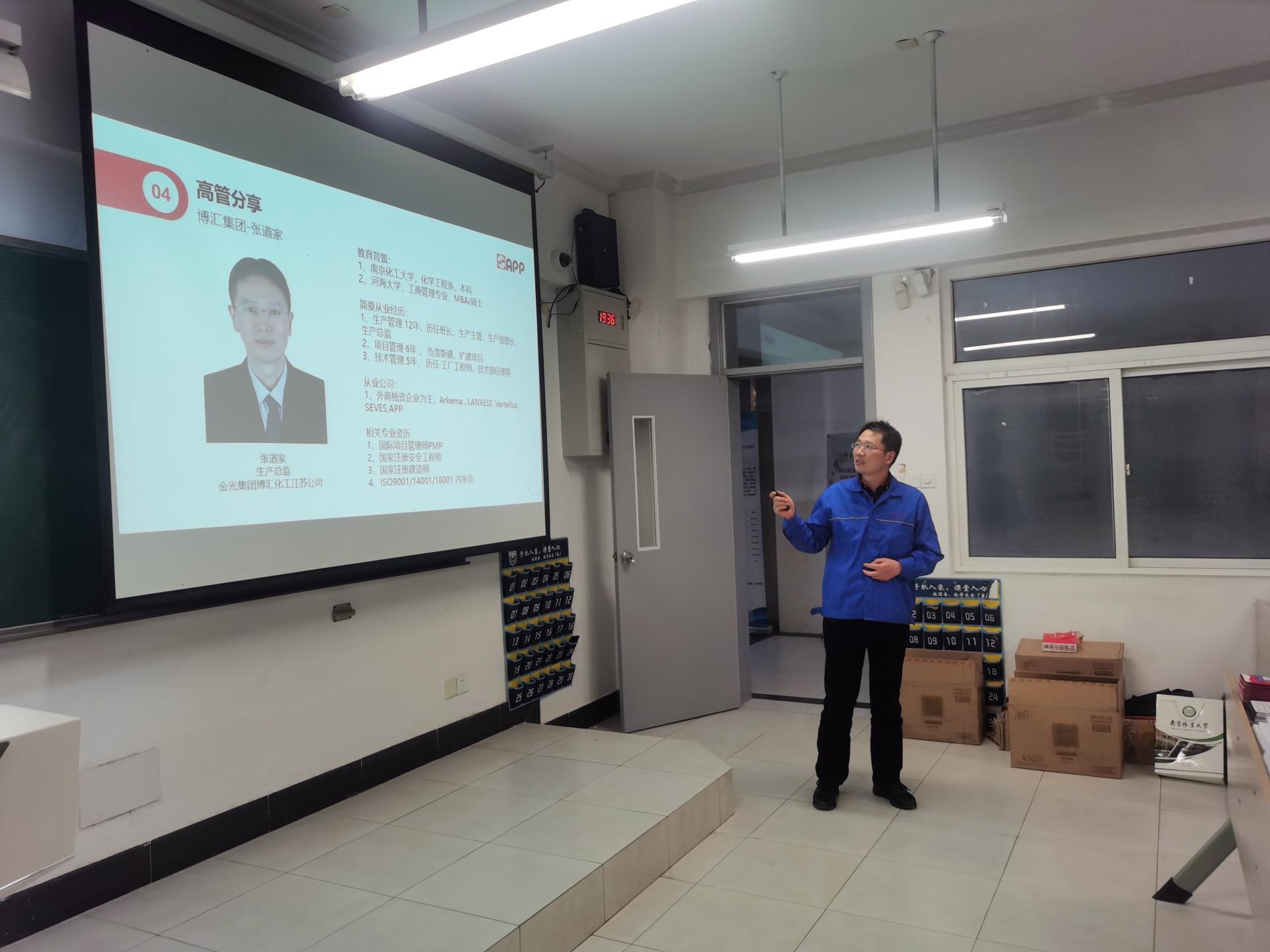 为引导员工树立正确职业生涯理念,明确未来目标和发展方向,太阳成集团tyc234cc于3月25日晚在厚学303举办生涯教育讲座,公司2017级、2018级本科生和2018级研究生参加讲座。优秀员工、金光纸业集团博汇化工江苏公司生产总监张道家受邀主讲。