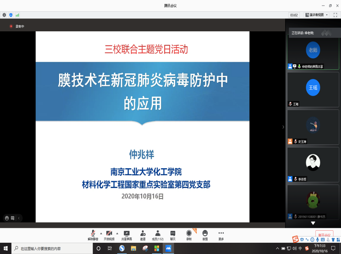 太阳成集团tyc234cc膜科学技术研究所仲兆祥教授给大家做关于“膜技术在新冠疫情防控中的应用”的报告。自新冠肺炎疫情暴发以来,仲兆祥教授团队在已有科技成果基础上,开发出一种新型过滤材料——纳米蛛网仿生膜,并应用到高性能膜法口罩生产中,用膜技术成果扛起战“疫”使命担当。在报告中,仲兆祥教授对口罩的生产背景、口罩的发展历程与原理、膜材料在空气净化中的应用进行了介绍,并且通过视频的形式向同学们展示了口罩的生产设备以及生产过程。最后,仲兆祥教授谈及同学们对待科研的态度:创新贵在坚持,鼓励同学们在科研道路上要勇于坚持,不能轻言放弃。报告结束后,同学们踊跃提问。有同学问到“这款口罩的透气率为什么比普通口罩好”;有同学提及“口罩折叠后,结构会不会发生断裂呢”;还有同学问到“膜技术成本高,这样的KN95口罩如何解决成本的问题呢”。对于这些问题,仲教授一一给出了详细的解答。
