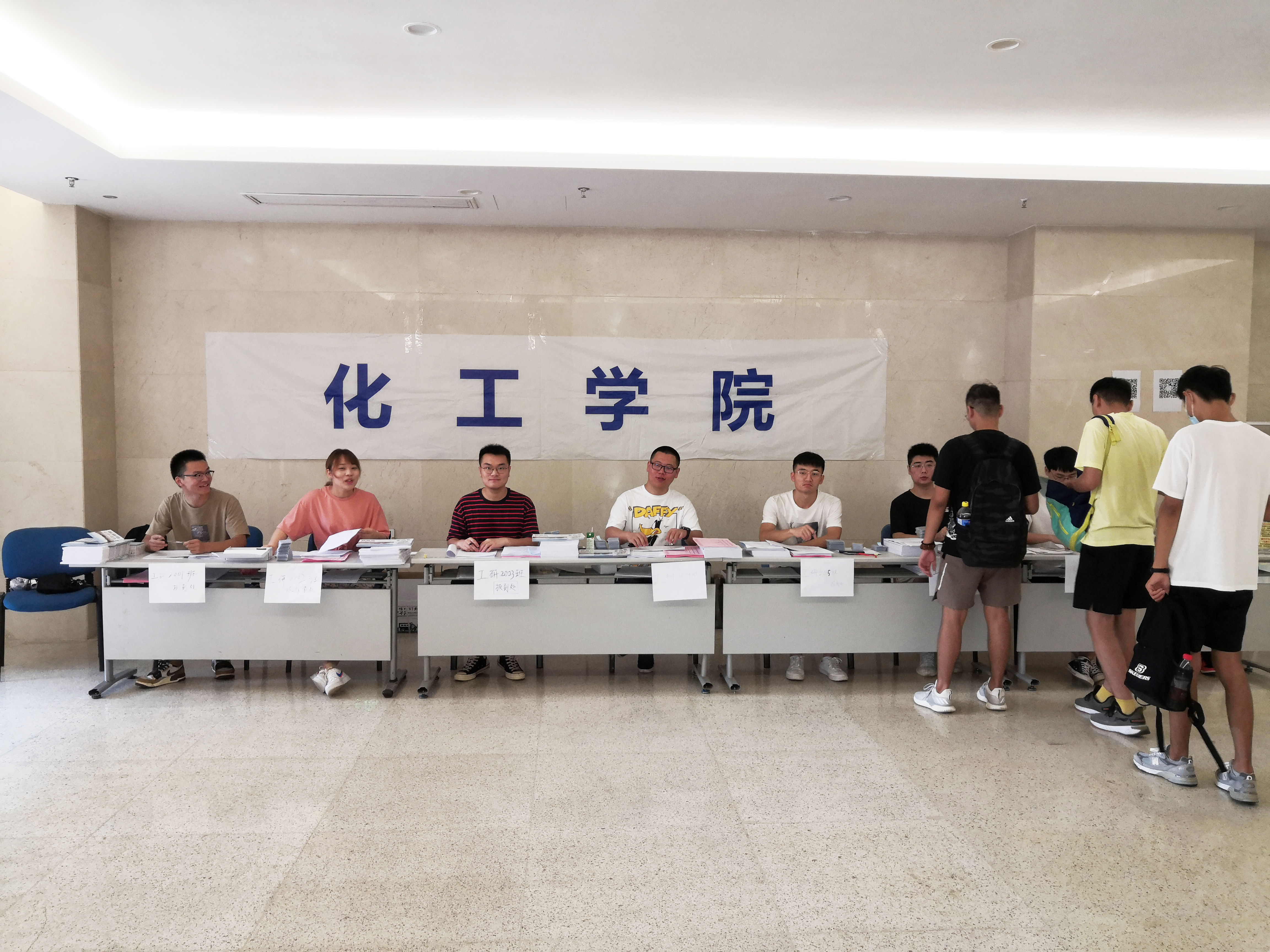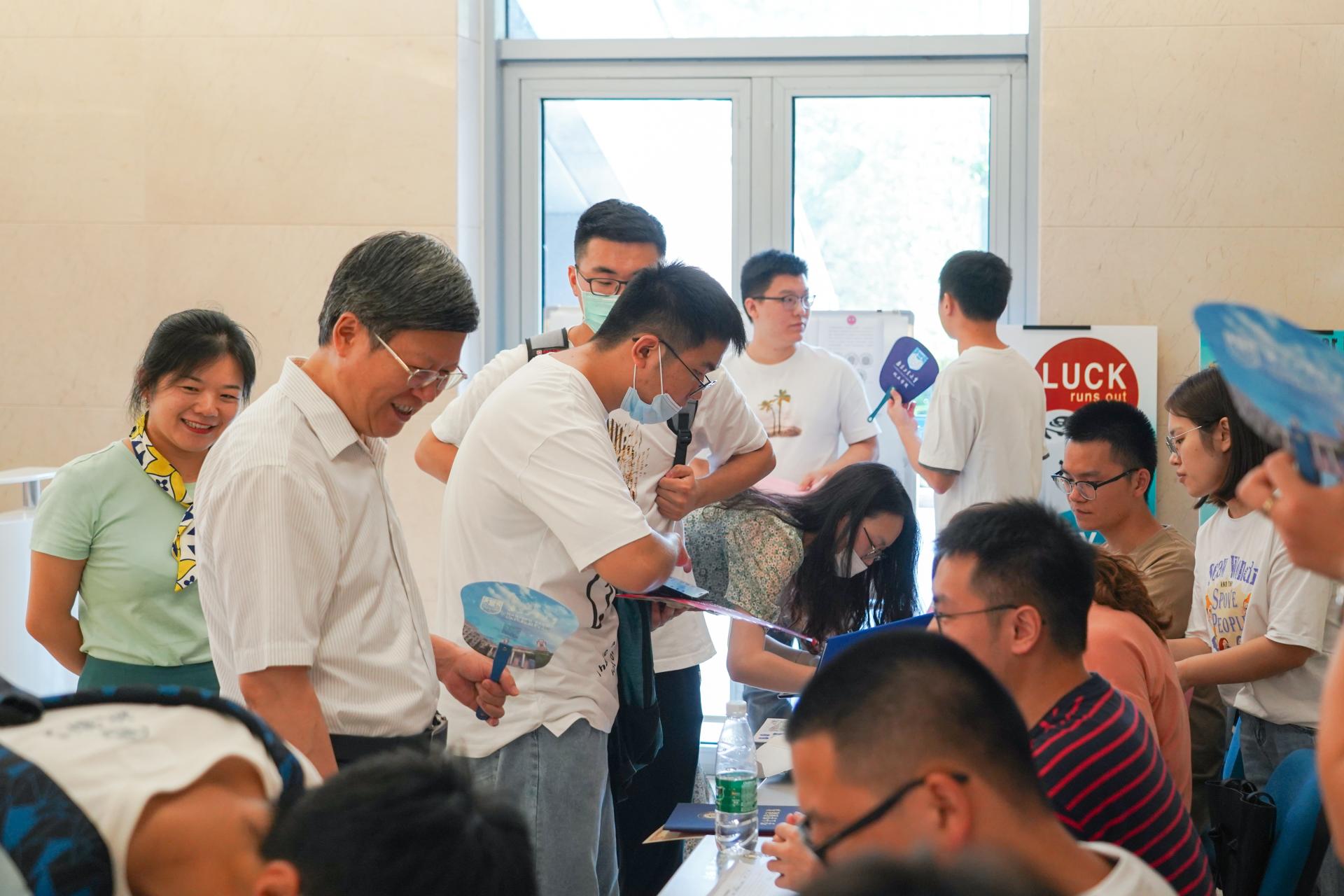 为了做好新生的报到工作,太阳成集团tyc234cc做了精心细致的准备与安排,组织志愿者在公司南门口、厚学楼驳车点帮助同学搬运行李。在弘毅楼大厅报到点,工作人员细心地为每一位新生办理报到手续,由于天气较为炎热,公司为每一位新生准备了定制的小扇子,新生报到工作井然有序的开展。