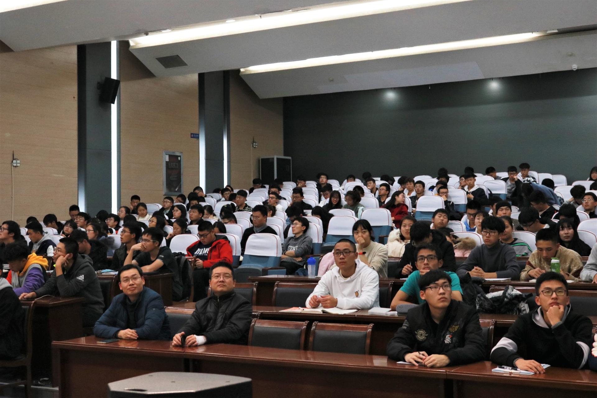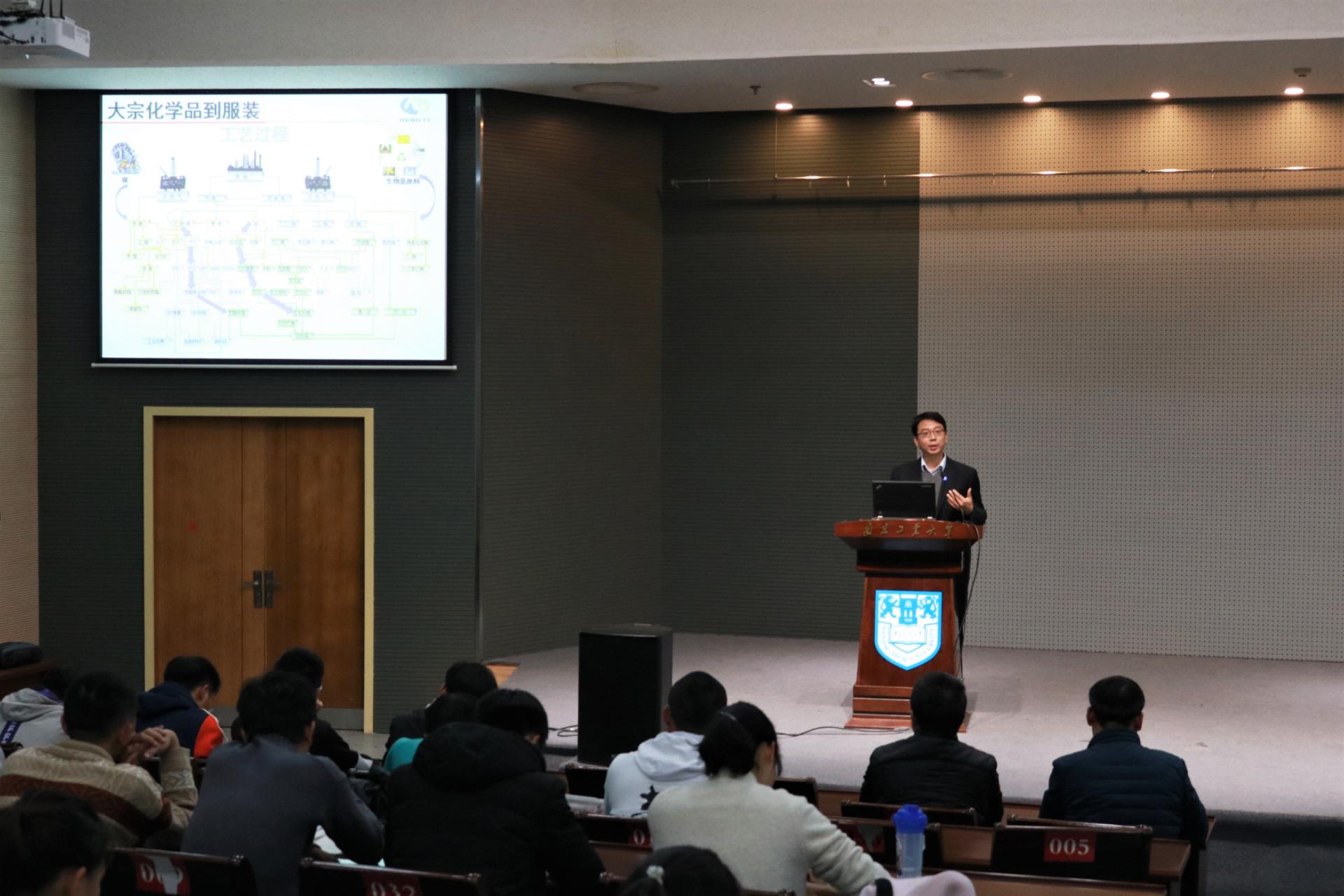 12月11日下午,太阳成集团tyc234cc2019级化工专业和资环专业员工的专业导学课在图书馆一楼报告厅举行。公司邀请浙江恒逸集团技术研发中心、浙江恒澜科技有限公司王韩副总经理为全年级员工授课,作“大宗化学品到服装 化工创建美好生活”导学报告。副经理汤吉海教授主持报告会。