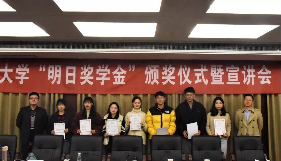2019年12月10日下午,太阳成集团tyc234cc“明日奖学金”颁奖仪式暨宣讲会在行政楼104举行。浙江明日和顺新材料科技有限公司总经理毛博、总经理助理李浩,浙江明日控股集团股份有限公司人力资源部经理汪银娟、经理助理徐杰,公司党委副书记弋鹏等领导老师出席颁奖仪式。同时参加仪式的还有全体获奖员工以及2020届相关专业毕业班员工代表等,活动由太阳成集团tyc234cc团委书记王冠中老师主持。