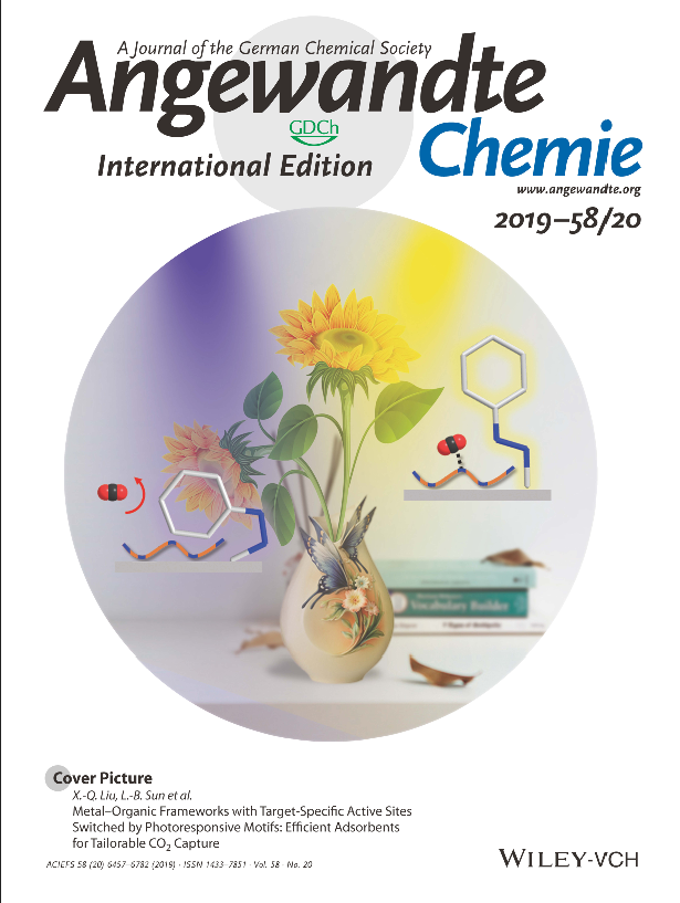 在国家自然科学基金优秀青年基金等项目的资助下,孙林兵教授的团队设计了一种基于介孔分子筛的智能吸附剂,能够通过简单的光照实现对二氧化碳的可控吸附,有望代替传统的变温和变压吸附过程,大幅度降低吸附过程的能耗。相关工作发表在美国化学会《Chem. Mater.》(2018, 30, 3429-3437)上。此外,他们首次将强吸附活性位引入到光响应金属有机-框架材料中得到一种智能吸附剂,能够通过响应分子与活性位之间的协同作用,实现对二氧化碳的低能耗可控捕集;并通过多种表征和模拟计算阐述了吸附机理。该成果以封面的形式刊登在国际化学领域顶级学术期刊《Angew. Chem. Int. Ed.》(2019, 58, 6600-6604)上。