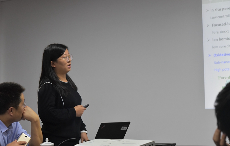 赵静博士报告中介绍了在瑞士洛桑联邦理工进修期间,针对单层石墨烯膜难以实现高密度亚纳米级孔的问题,面向气体分离应用,从致孔原理出发,提出了缺陷成核与缺陷生长分步协同的策略。