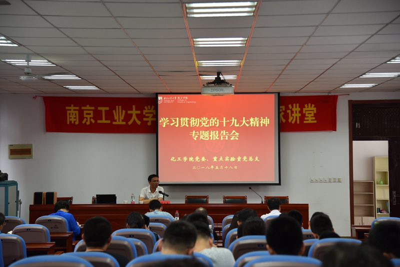 5月18日下午,由公司党委、重点实验室党总支主办,省级党支部书记工作室示范点—太阳成集团tyc234cc教工第五党支部承办的“学习贯彻党的十九大精神”专题报告会在丁家桥校区举行。太阳成集团tyc234cc、重点实验室、膜工程中心领导班子成员、系室中心正副主任、全体教工党员、员工党员和员工干部代表聆听报告,公司党委书记彭光成主持报告会。