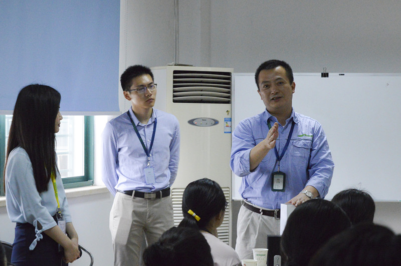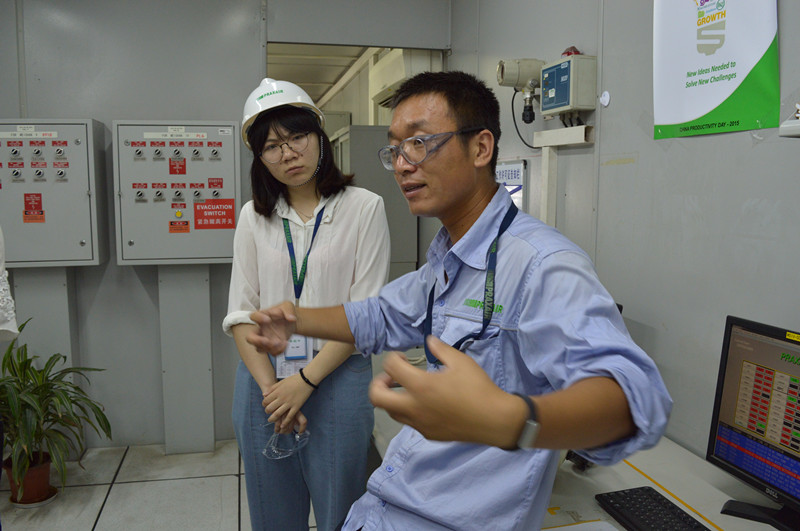 离开配送部,一副真实的工厂图貌展现在眼前。公司工艺主管马俊与维修主管赵伟带领学员们对工厂内部进行参观。除了详尽的讲解,他们也会不时提问,让学员们结合课本所学解答生产中的问题。风趣幽默的语言,专业的学术指导,实践经验的分享,让学员们进一步深入了解普莱克斯的生产,感受普莱克斯的氛围。