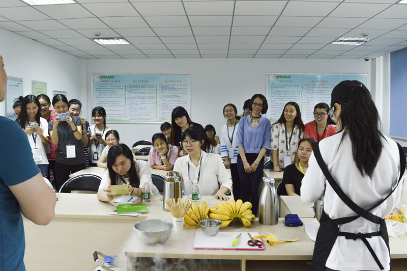 接下来,学员们见证了普莱克斯产品之一——液氮在生活中的实际应用。源于新加坡的“G9分子冰淇淋”展示了运用液氮的冷冻能力,现场制作纯天然的水果冰淇淋。学员们在享受美食的同时,不禁感叹普莱克斯产品对于我们生活的影响。