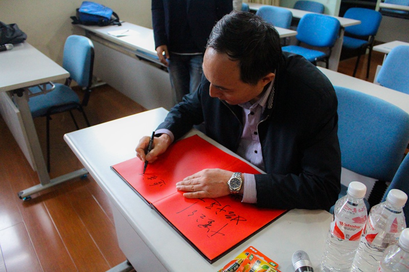 在互动提问环节,金老师一一回答了同学们的问题。针对目前如何在诸多科研方法中更有效的抓住科研思路,金老师认为现在是信息化时代,员工要关注课题的最前沿,静下心来,脚踏实地,要经得住诱惑,合理利用现代科技,不要沉迷于手机。活动最后,金老师为本次活动题词:追求梦想,坚持实干。