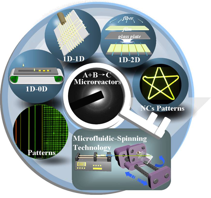 微流控技术及其微反应器的研究是国际科技前沿研究的重要课题之一。通过将化学反应缩小到在微米以及纳米尺度可实现多种化学反应高效化实施,并具有化工微型化技术优点和应用优势。在该项研究中,首先以微流体纺丝技术成功编织出微阵列和网格,通过其阵列交汇处制成出1D-0D, 1D-1D 和 1D-2D多维度微反应器。该类微反应器(10-15 m3)可在室温条件下成功制备出高质量的量子点及其阵列。其创新在于采用微流体纺丝技术可方便制备出多维度反应器,为固-固、固-液界面反应提供了一个很好的微反应器平台。受到评阅人高度评价。“The articles has several features, viz. a new breed of microreactors of varying dimensionality and mixed junctions of PVP microarrays; these enable in-situ synthesis of nanosized precipitates such as nanocrystals but also have features related to chemical microreactors, microfluidic spinning, microscale grids and patterns. Aspects still to be demonstrated but deemed to be feasible include the generation of new hybrid materials of defined physical structure.”