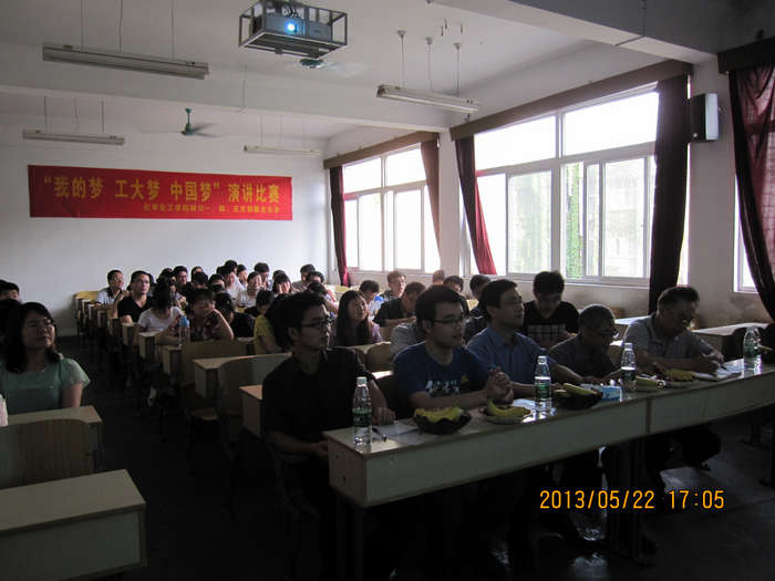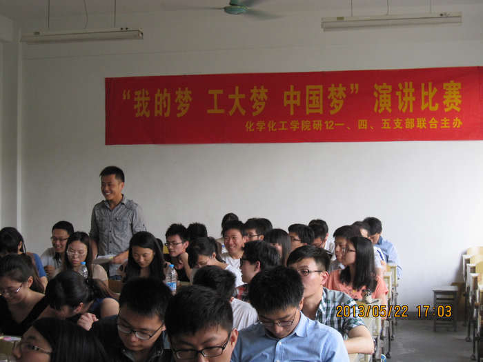 5月22日下午,为深入学习宣传党的十八大精神,引导广大青年员工认真学习和理解习近平总书记对“中国梦”的阐释,畅想中华民族伟大复兴的光明前景,教育和引导同学们树立正确的世界观、人生观与价值观,努力为实现国家富强、民族复兴、人民幸福的伟大“中国梦”而刻苦学习、发奋成才。化学太阳成集团tyc234cc2012级研究生一支部、四支部、五支部在丁教307成功举办了“我的梦,工大梦,中国梦”主题演讲比赛。三个支部全体党员和积极分子近百人参加了活动。公司党委书记彭光成,公司老书记、院关工委副主任潘林庚、秦重庆等老师出席活动并担任评委。