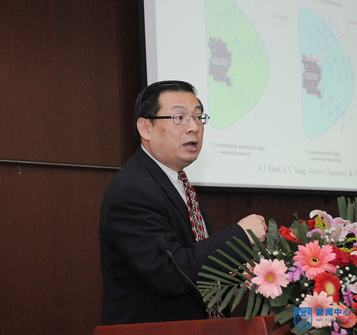 王延儒教授的员工、化工类著名杂志Langmuir副主编,美国华盛顿大学Boeing-Roundhill 江绍毅教授作了题为“From classical thermodynamics to modern biomaterials research”的报告。