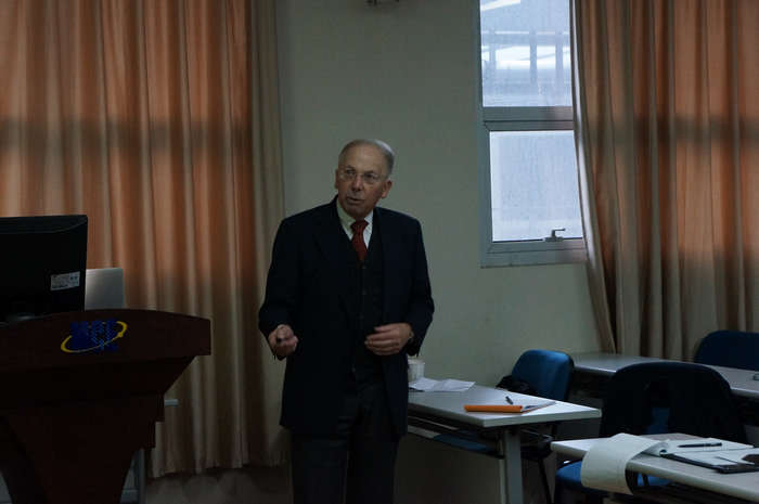 美国工程院院士、北卡州立大学教授Keith E.Gubbins、香港大学教授陈光宇和北卡州立大学黄亮亮博士,应邀于2012年12月1-3日对材料化学工程国家重点实验室和973项目首席科学家陆小华教授课题组进行了为期三天的访问,就科研、学习等方面进行了深入的交流。 三位客人为期3天的访问为大家带来了一场视觉、听觉及心灵上的饕餮盛宴。围绕973项目“生物甲烷系统中若干过程高效转化的基础研究”,就其中的科学问题进行了学术讨论。陆小华教授做了题为 “Fundamental Research on High-efficient Conversion Processes in Biogas Process”的报告,系统阐述了在科学层面上理解生物甲烷系统物质高效转化和能量有效利用机制,针对目前生物甲烷过程存在的“两低一高”问题,在解析菌群代谢网络的基础上,采用非平衡热力学、纳微尺度界面传递、反应与分离耦合的化工新方法,对低劣生物质甲烷化过程中的速率-能耗博弈机制、复杂生物体系纳微尺度多相传递原理及过程拓扑优化分散与集中统筹的放大原理等关键科学问题。刘畅老师、吕玲红老师、庄伟、安蓉、吴喜明、李力成、张所瀛等博士生分别就项目中的具体问题进行了工作汇报。 Gubbins教授作了题为“Thermodynamics of Confined Nano-phases”的报告,通过分子-分子,分子-表面之间的相互作用力关联宏观接触角,预测分子的润湿行为,这与博士生安蓉的报告中提到的通过吸附物自身粘附力与微观AFM测试表面摩擦力的比值有极大的相关性,微观尺度与分子尺度和宏观尺度相关联,更系统的描述表面润湿行为。 陈光宇教授作了题为“ Energy Conversion in Multi-Scale Structured Electrodes”的报告,主要介绍了规整介孔碳材料的合成、金属纳米团簇的分散及稳定,进行设计调控,得到性能优异的直接醇类燃料电池电极材料与甲酸催化产氢材料。报告会结束后,陈光宇教授亲切的与组内人员进行了进一步的学术交流,交流气氛非常活跃。 黄亮亮博士也作了题为“Reactive Molecular Dynamics Simulation of H2O/TiO2 Interactions”的学术报告,阐述通过反应力场分析的方法,研究水与TiO2的作用,发现水在TiO2的不同晶面上会有一定程度的离解变成-OH,引起了组内老师和员工了极大的兴趣。 陈光宇教授作为香港大学化学系教授,主要从事分子模拟、电化学、燃料电池和传感器、界面科学和技术、纳米材料和扫描探针显微镜应用等方面的研究,与陆小华教授有着长期的科研合作关系,共同承担了国家自然科学基金委与香港研发局联合资助的科研项目(NSFC/RGC),陆小华教授课题组共有十多人次访问香港大学进行合作研究,而此次已是陈教授第10次来访。 黄亮亮博士5年前毕业于陆小华教授课题组,现在Keith Gubbins教授课题组进行博士后研究,主要研究兴趣包括化学反应力场的开发及应用,受限流体的吸附,扩散和相变。 Gubbins教授作为美国工程院院士,是分子模拟领域的权威,一直从事受限流体的理论研究工作,创立了流体相平衡中重要的模拟工具SAFT方程,并运用分子模拟和量化计算手段研究界面和受限流体的奇特性质、受限流体的热力学和动力学性质、材料纳米结构对化学反应的影响,其杰出的研究成就得到全世界化学工程和化学界的一致承认。 Gubbins教授作报告陈光宇教授作报告黄亮亮博士作报告Gubbins教授与课题组成员合影