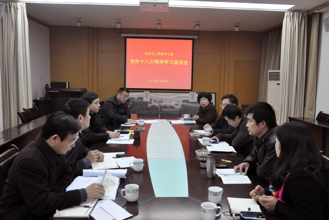 2012年11月26日下午,公司党委理论学习中心组成员在化工楼203举行了“党的十八大精神学习座谈会”。集体观看了中共中央党校周天勇教授作的“党的十八大报告解读”视频,公司党委书记彭光成以“我对党的十八大报告精神的学习和理解”为题,与大家交流分享了自己的学习心得。在随后的座谈讨论中,大家一起围绕不久前党的十八大代表、省长助理徐南平院士在全校所做辅导报告的内容,重点就科技创新驱动、提高公司产品质量等展开了热烈的讨论。通过学习座谈讨论,大家普遍感到很有收获。