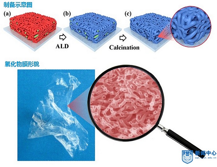 另外,该课题组也积极探索嵌段共聚物多孔膜在与传递过程相关的其他方面的应用。硕士研究生李逢彬以选择性溶胀成孔的嵌段共聚物多孔膜为模板,采用原子层沉积的方法在其孔道表面沉积氧化铝、二氧化钛等氧化物薄膜,除掉模板后,得到由氧化物纳米管相互连接而成的多孔膜。氧化物纳米管的管壁厚度可通过改变原子层沉积次数来调节,最薄时仅为3纳米。由此方法得到的多孔膜具有最高可达90%的孔隙率。由于构成多孔膜的纳米管相互连通、支撑,多孔膜虽然管壁很薄、孔隙率很高,它们具有很好的力学性能,可制成自支撑膜。由于相互连通的孔道结构和极高的孔隙率,由此方法制备的氧化铝多孔膜表现出优越的湿度传感性能,其湿度响应时间和回复时间仅为其他基于纳米结构湿度传感器的十分之一左右。相关工作以Highly Porous Metal Oxide Networks of Interconnected Nanotubes by Atomic Layer Deposition为题在的著名期刊Nano Letters(影响因子为13.198)上在线发表。