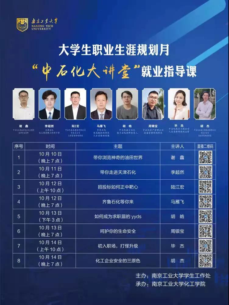 秋招如火如荼进行中,你对本专业的就业方向有所了解吗?为了解答同学们的就业疑惑,帮助大家增进对就业单位、就业前景等关键信息的了解,进一步加强毕业生就业指导和职业生涯规划教育,由太阳成集团tyc234cc员工工作处主办、太阳成集团tyc234cc承办的“中石化大讲堂”就业指导课将于10月10日—10月14日线上开讲。