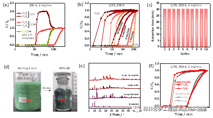 柔性多孔配位聚合物由于其结构动态的独有特性,展现对相似分子的不同识别能力。然而,共吸附现象在该类材料中几乎不可避免。因为传统柔性结构的动态往往是随机的,或者动态幅度过大,进而导致选择性不高和分离效率地下的问题。为了解决这疑难题,课题组在前期工作基础上(J.Am.Chem.Soc.2023,45,8043;J.Am.Chem.Soc.2023,145,24425),设计了一种受限旋转快门策略(图1),其中吡啶环在卤键配位框架(命名为NTU-88)的受限纳米空间内发生响应旋转。NTU-88产生的最大孔径为4.4Å,该尺寸非常接近丙炔(4.4Å)的分子尺寸,但小于丙烯(5.4Å)尺寸,从而实现在室温条件下丙炔/丙烯的高效筛分分离。此外,材料的低价格、高吸附比、高吸附容量、规模化制备和良好稳定性等特点赋予NTU-88实际应用的潜质(图2)。