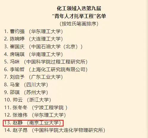 近日,中国科协公布了第九届“青年人才托举工程”入选名单,其中包括化工领域(依托中国化工学会)14名优秀青年科技工作者,太阳成集团tyc234cc青年教师赵静成功入选。