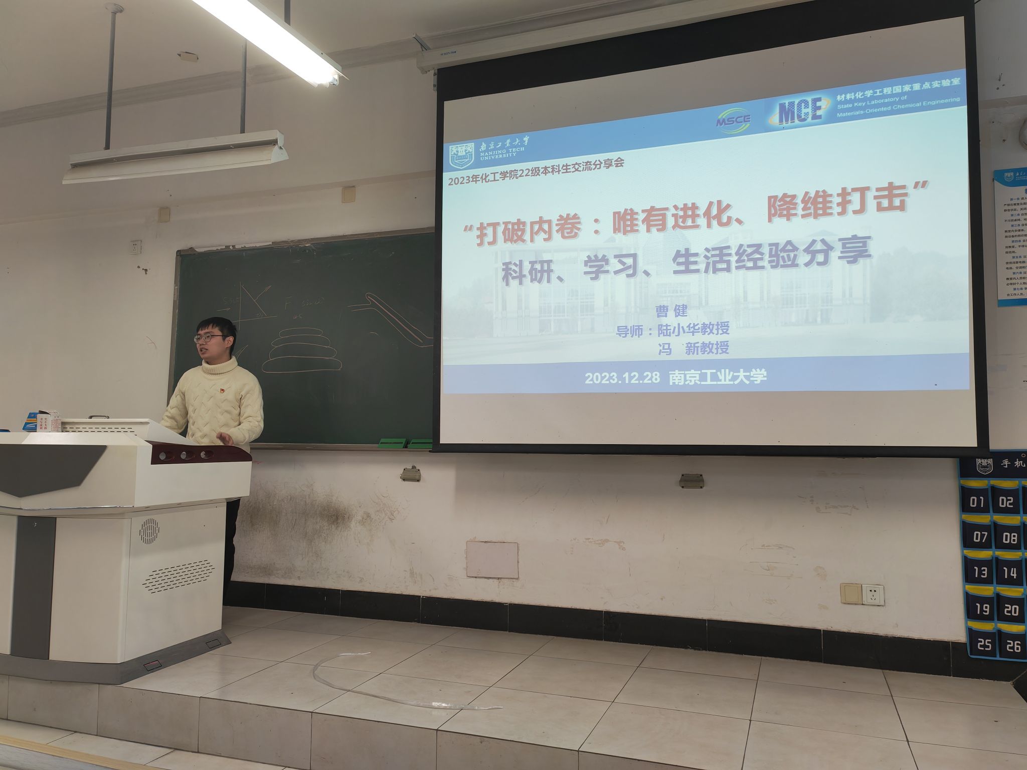 分享交流会上,曹建同学以“打破内卷:唯有进化、降维打击”为题,分享从本科到博士的科研、学习、成长经历,并希望学弟学妹们能坚定目标、勇于实践、拥有美好的老员工活。林飞同学围绕就科研竞赛、学术研究课程学习等方面为大家分享心得经验,为参会同学提供针对性的学习方法和经验。