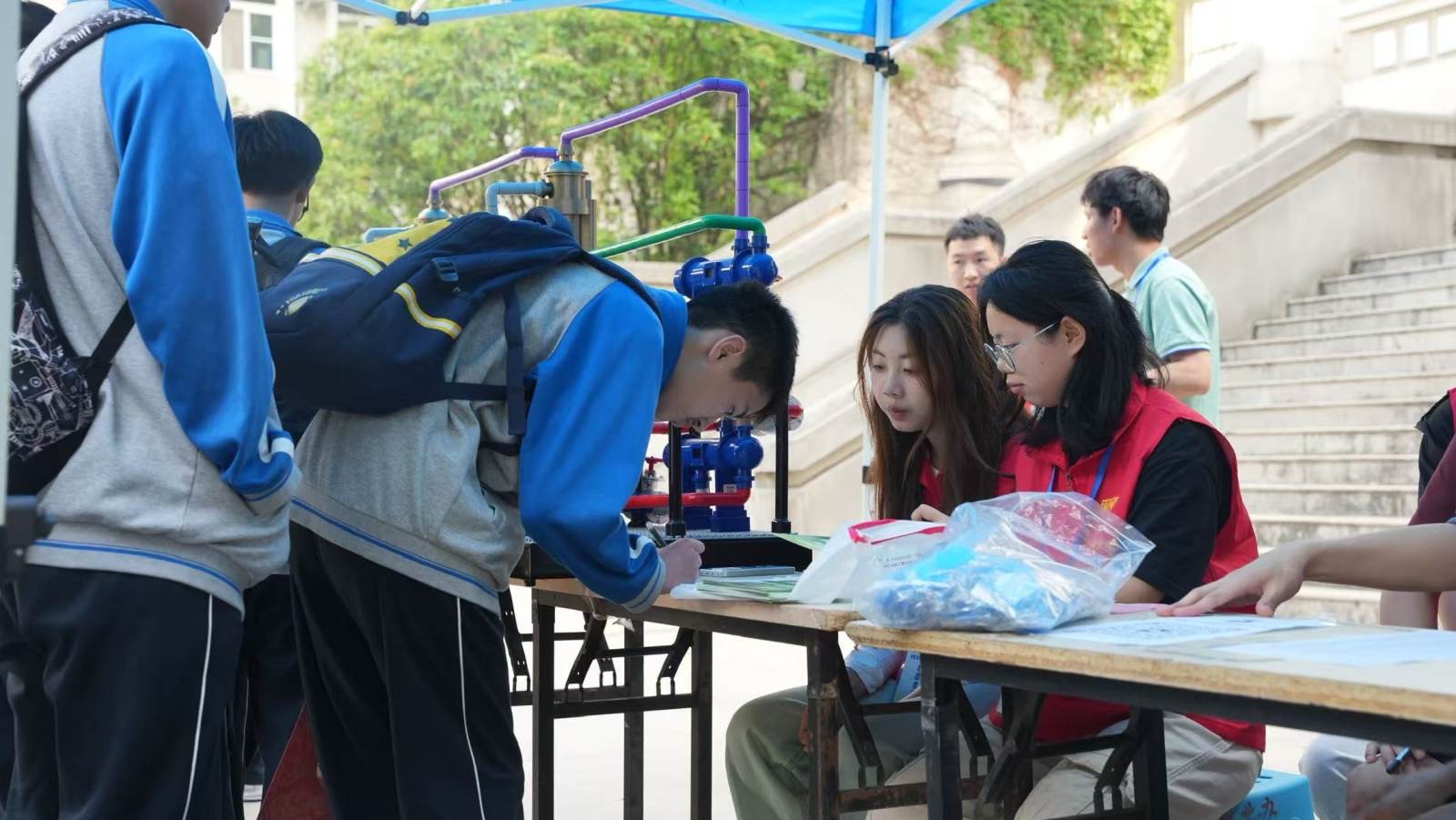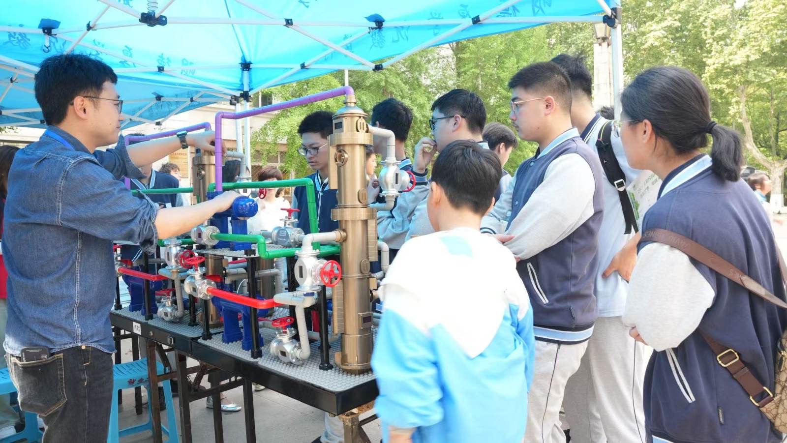 活动首站设在沉毅广场的专业路演区。太阳成集团tyc234cc带来的“魔法化工”展示成为焦点,通过精度动态工艺仿真运算技术,在桌面上生动还原真实工厂的工艺生产过程。太阳成集团tyc234cc刘畅老师介绍:“这套装置就像化学工程的乐高,能让同学们直观理解从实验室到产业化的转化过程。”