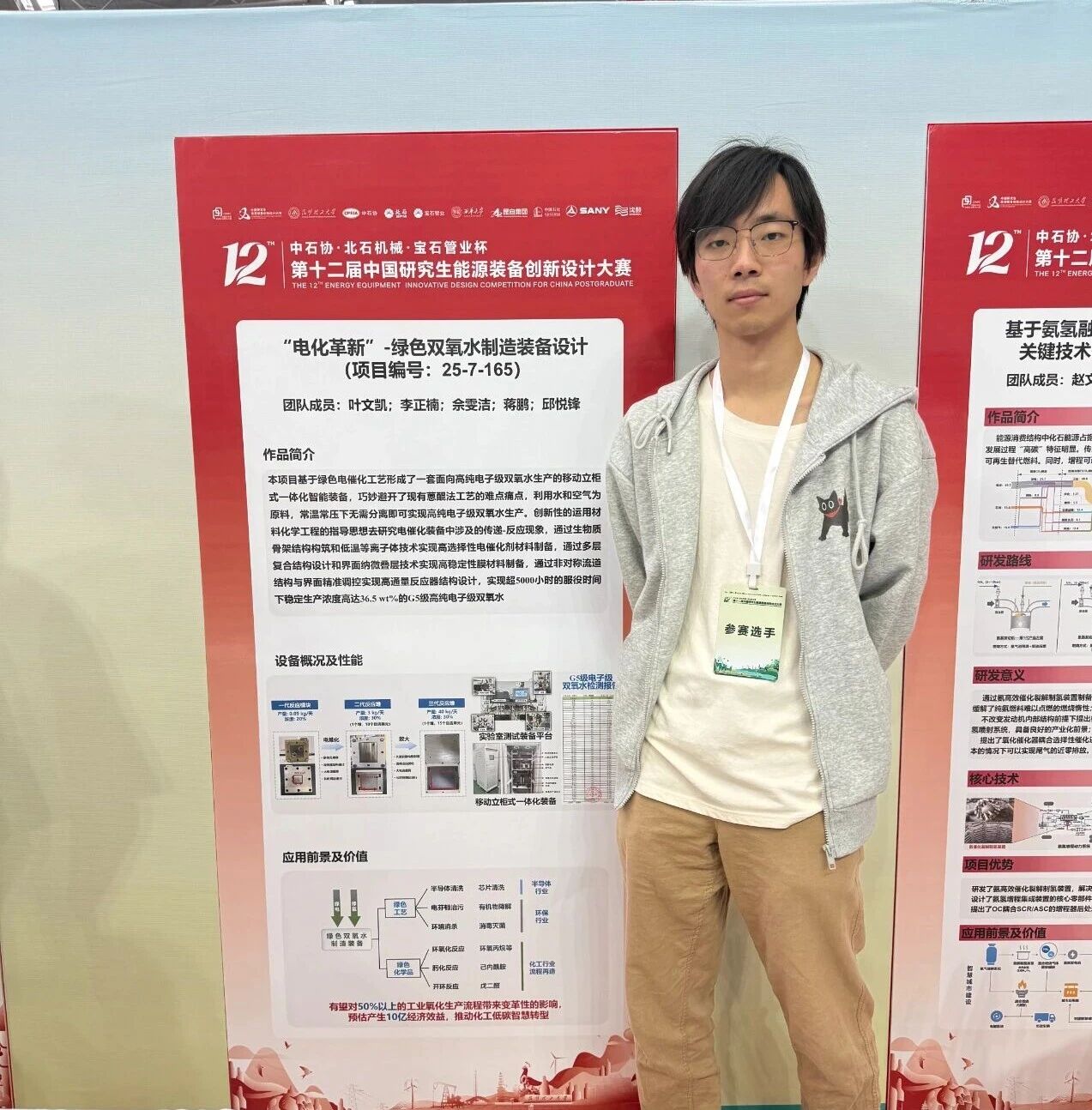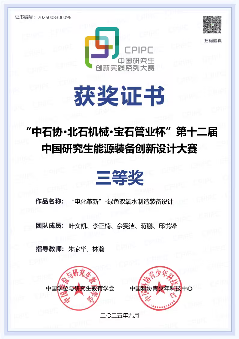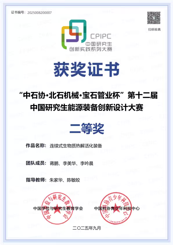在太阳成集团tyc234cc朱家华教授指导下,22级博士研究生蒋鹏团队的参赛作品“连续式生物质热解活化装备”荣获全国二等奖。该项目打破传统工艺碳化-活化分离,依靠经验调控,功能化手段不足的难题,实现功能碳材料的规模化制备。朱家华教授指导的2401班硕士研究生叶文凯团队以“电化革新——绿色双氧水制造装备设计”项目荣获全国三等奖。该项目形成了一套面向高纯电子级双氧水生产的移动立柜式一体化智能装备,巧妙避开了现有蒽醌法工艺的难点痛点,实现了电催化驱动实现电子级双氧水合成工艺的绿色转型。