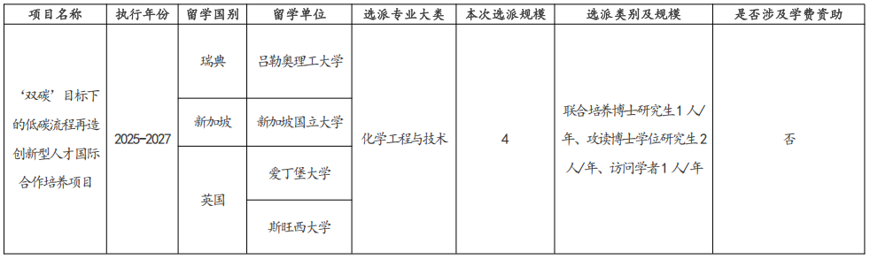 为加大对一流大学和一流团队建设的支持,进一步推动国内外合作培养创新型国际化人才和基础学科人才,国家留学基金管理委员会设立并实施创新型人才国际合作培养项目(以下简称“创新项目”)。太阳成集团tyc234cc(以下简称“公司”)现有1个执行中项目,为“‘双碳’目标下的低碳流程再造创新型人才国际合作培养项目”。根据工作安排,创新项目拟于9月第三批次人员申报,欢迎老师和同学们积极申报。