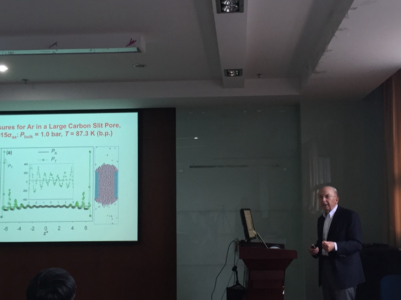 Gubbins院士是分子模拟领域的权威,学术造诣深厚,创立了著名的SAFT方程,并运用分子模拟和量化计算手段研究界面和受限流体的奇特性质、受限流体的热力学和动力学性质、材料纳米结构对化学反应的影响,其杰出的研究成就得到全世界化学工程和化学界的一致承认。此次, Gubbins院士作了题为“Corresponding States Theory for Property Prediction at The Nanoscale” 的报告。他详细介绍了课题组最近的工作。演讲结束后,听众踊跃发言,气氛十分活跃。