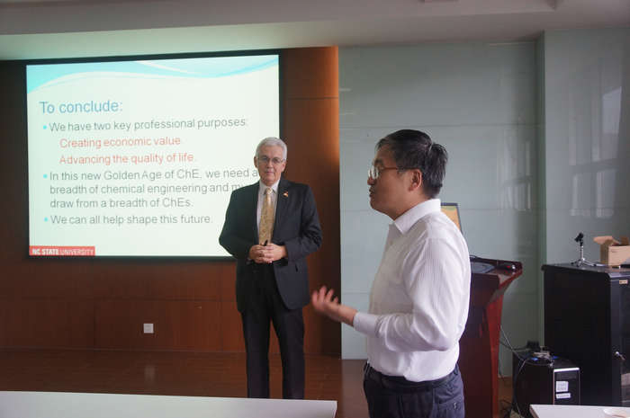 10月7日上午,公司名誉教授、AIChE主席、Westmoreland教授应公司陆小华教授邀请,访问化学太阳成集团tyc234cc、材料化学工程国家重点实验室,给广大师生做了题为“Molecular Kinetics of Making Bio-oils: Opportunities and Challenges for a Golden Age of ChE”的精彩报告。作为AIChE主席,Westmoreland教授非常了解美国化工界乃至于全世界化工界的发展趋势,让大家了解了化工界最新的前沿动态。报告中,Westmoreland教授认为生物油品的研究是化学工程黄金阶段的机遇和挑战之一。Westmoreland教授使用计算方法和新型实验手段在分子尺度对于生物质结构转变和反应做了深入研究和分析,有利于生物质等清洁能源的可持续性发展,对于医药、环境、计算机等尖端科技领域也做出了很大的贡献,同时为开发低CO2排放量的新能源做出了贡献,而这正符合中国国情,westmoreland教授在报告中也重点阐述了中国的国情,期望通过和国内学者们的合作共同解决这一世界性难题,范益群教授、金万勤教授、王军教授以及美国DOE的Fan Shi 博士等老师和员工们与他进行了深入的交流。